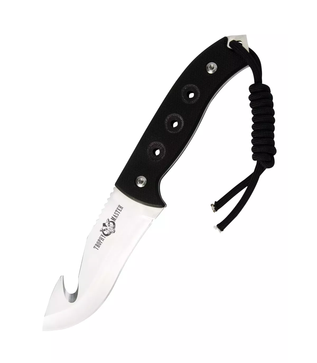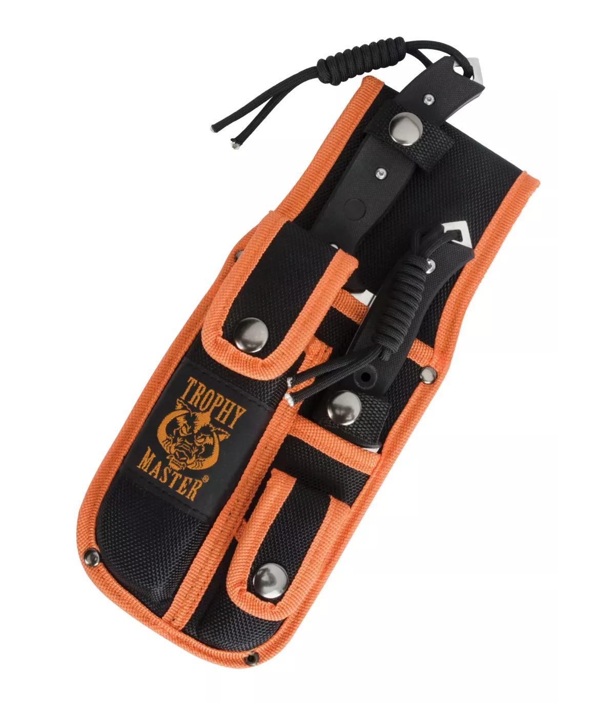 Jogo 3 facas de caça Trophy Master composto por um faca de açougueiro de espiga completa, uma faca desossa de lâmina fixa e uma faca de serra dobrável. Cada peça possui uma lâmina de aço inoxidável afiada com uma empunhadura resistente e antiderrapante de G-10.