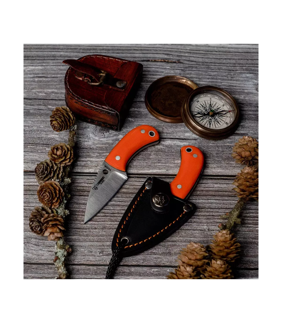 O cabo da faca Yoda Kydex da Cudeman é feito em plástico G10 laranja e vem remachado com alumínio plano, o que proporciona uma pegada confortável e segura. Além disso, inclui um orifício para cordão de segurança com separador preto, para que você possa levá-la a qualquer lugar.