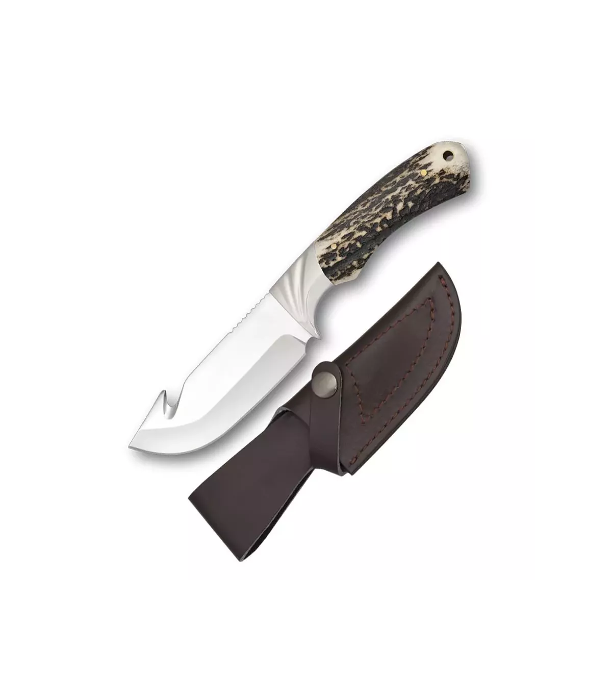 A empunhadura da faca é feita de chifre de veado, conferindo uma aparência natural e autêntica. Além disso, a faca de caça com empunhadura de chifre de veado inclui uma bainha de couro para proteger a lâmina e mantê-la em perfeito estado.