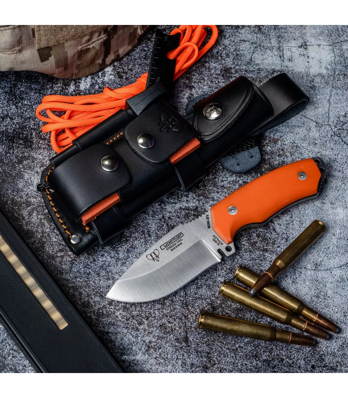 O Mini Boina Verde é o menor da família Boina Verde, mas não subestime seu tamanho, pois é um verdadeiro 4x4 em qualquer situação. Sua lâmina côncava a torna muito cortante e resistente, tornando-se uma ferramenta perfeita para saídas ao campo, missões táticas ou qualquer tarefa de corte que você precise realizar. Além disso, seu material G10 laranja com separador preto nas empunhaduras confere um toque chamativo e atraente.