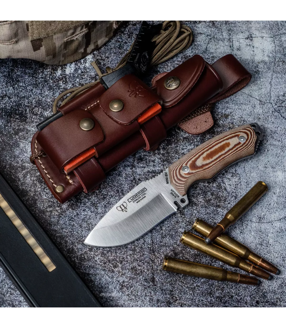 Fabricada em aço Böhler N-695 com dureza de 59/60 HRc na escala Rockwell, a Mini Boina Verde é a menor da família. Sua lâmina côncava a torna muito cortante e resistente, tornando-se uma ferramenta ideal para saídas ao campo, missões táticas ou qualquer tarefa de corte que você precise realizar. Além disso, seu material de micarta areia com separador preto nas empunhaduras reúne as características essenciais: resistência a impactos e impermeabilidade a respingos de água.