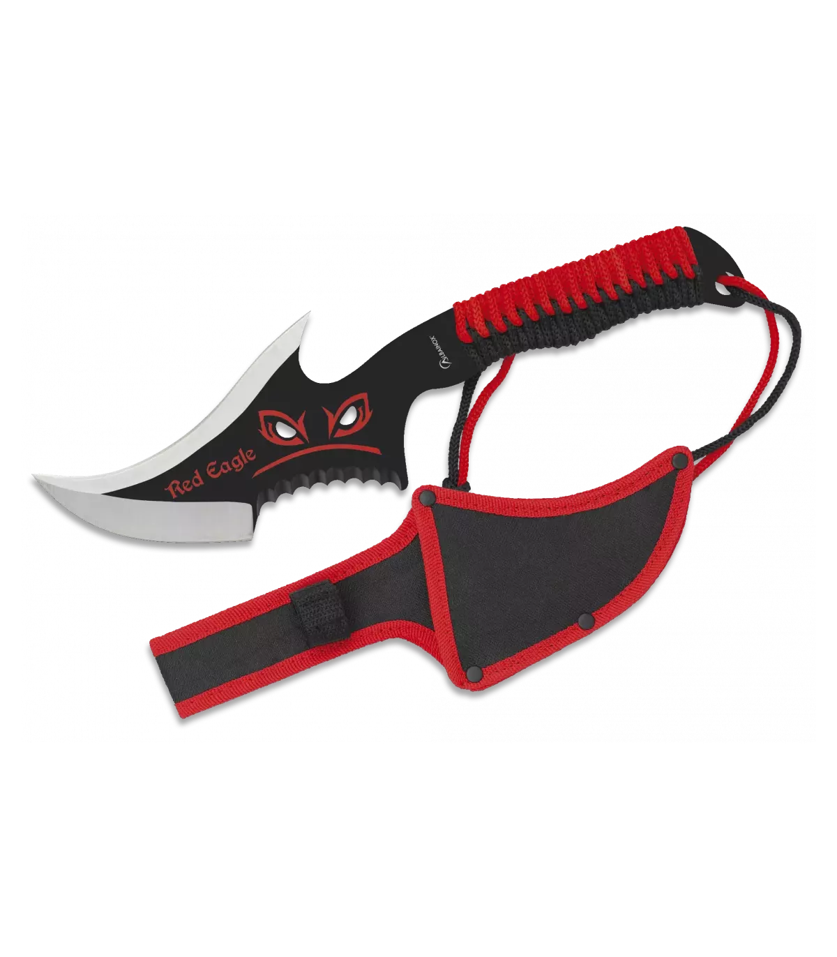A empunhadura com acabamento preto e vermelho proporciona uma pegada confortável e segura, tornando esta faca fácil de manusear mesmo em situações de alta tensão. Além disso, inclui uma bainha de nylon para que você possa levá-la aonde quiser.
