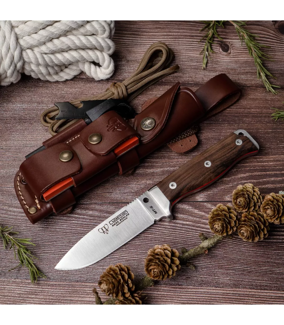 Fabricada em aço Böhler N-695, a MT-5 possui virolas de aço A-304 fosco e um cabo de madeira natural de nogueira com separadores vermelhos e pomo percutor na extremidade final de sua empunhadura. Na mesa de sua lâmina e no próprio pomo percutor, há dois pinos para criar uma lança com uma corda de segurança. A cremalheira em sua espinha garante uma pegada segura e confiável. Além disso, sua capa de couro marrom de alta qualidade é multifuncional e inclui o adaptador de couro com espelho de sinais, pedra de afiar, paracord 550 coyote e pederneira, tornando-se um kit completo para qualquer aventura.