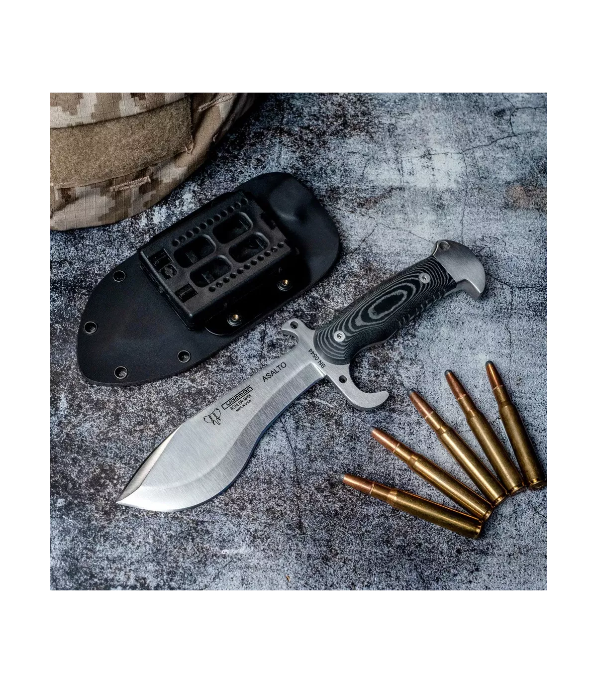 A faca de assalto 140-M-K é a arma definitiva para os amantes de atividades ao ar livre e aventuras extremas! Com sua lâmina de aço Böhler N-695 de escavação côncava e ponta drop-point, esta faca é perfeita para qualquer tarefa que exija força, precisão e durabilidade. Além disso, seu acabamento acetinado confere um aspecto elegante e moderno.