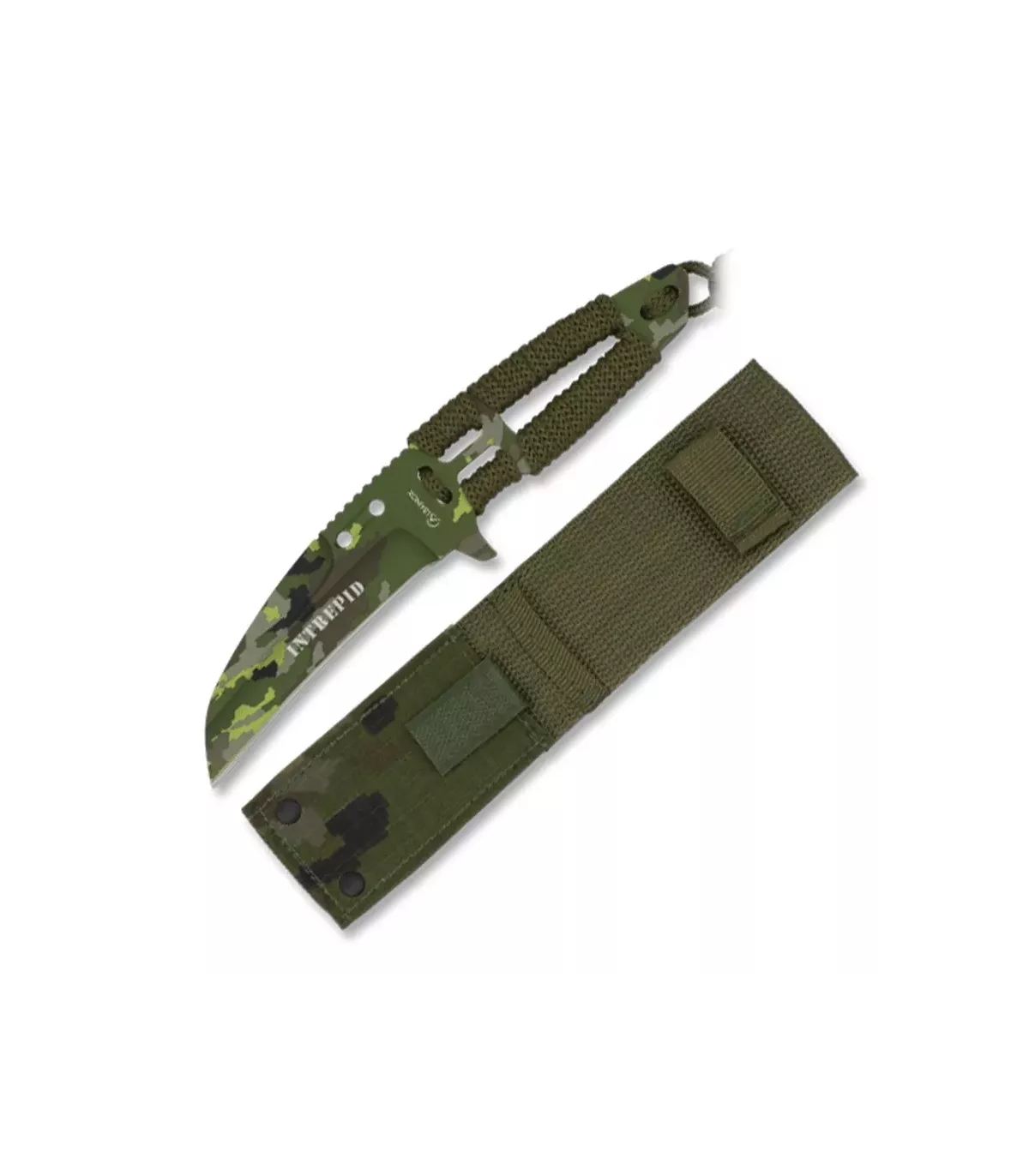 Transforme suas aventuras em uma experiência única com a Faca Tática Intrepid da marca Albainox na cor camuflagem! Esta faca possui um design elegante e sofisticado que lhe confere uma aparência distinta em qualquer situação. Além disso, seu cabo encordado de cor verde oferece uma pegada firme e segura o tempo todo.