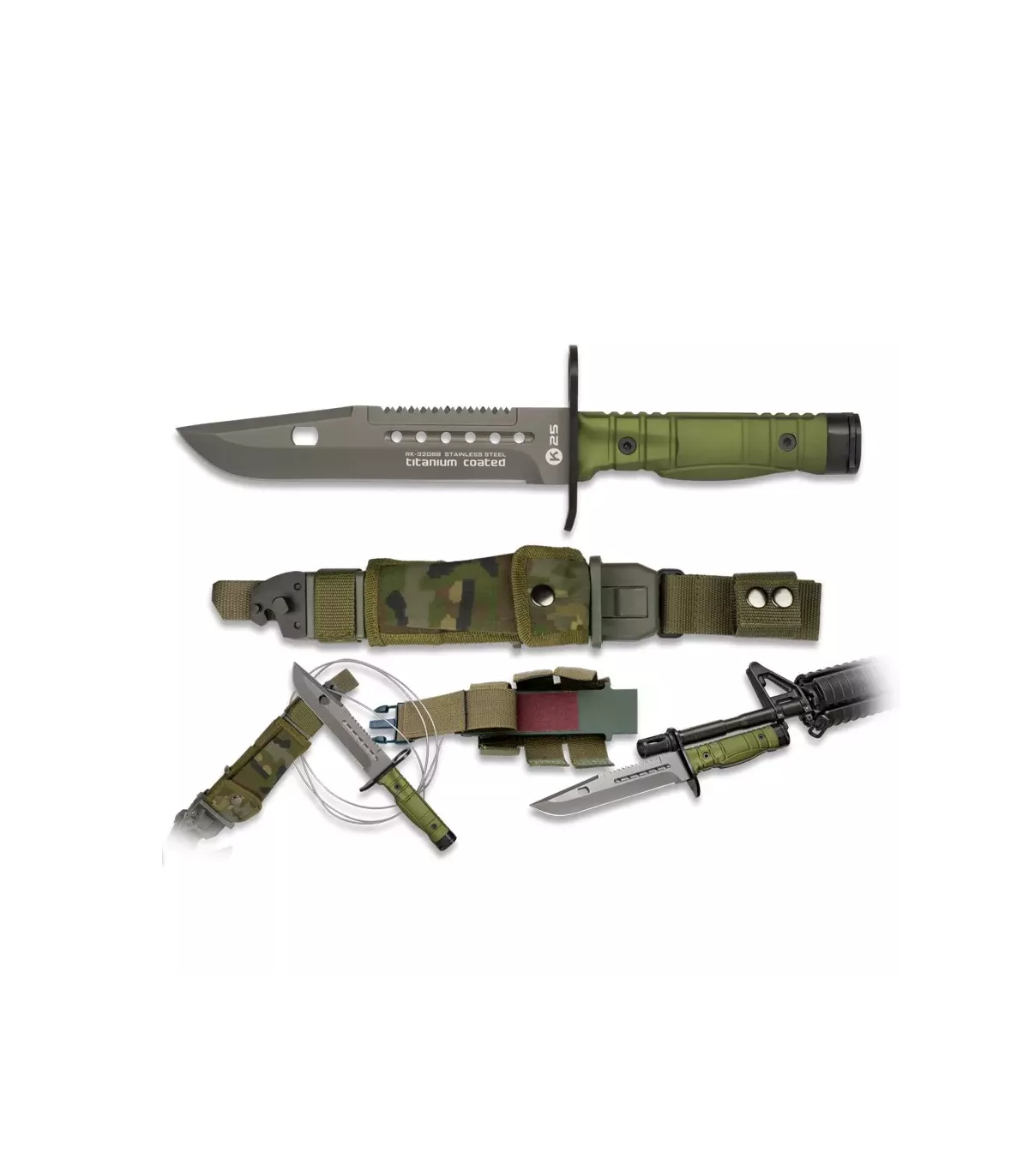 Você é um apaixonado por aventuras extremas e busca uma faca tática de alta qualidade? A Faca Tática Baioneta é a faca perfeita para você! Com uma lâmina de aço inoxidável revestida de titânio de 17,8 cm de comprimento e uma empunhadura verde revestida de borracha, esta faca proporcionará uma pegada firme e segura o tempo todo.