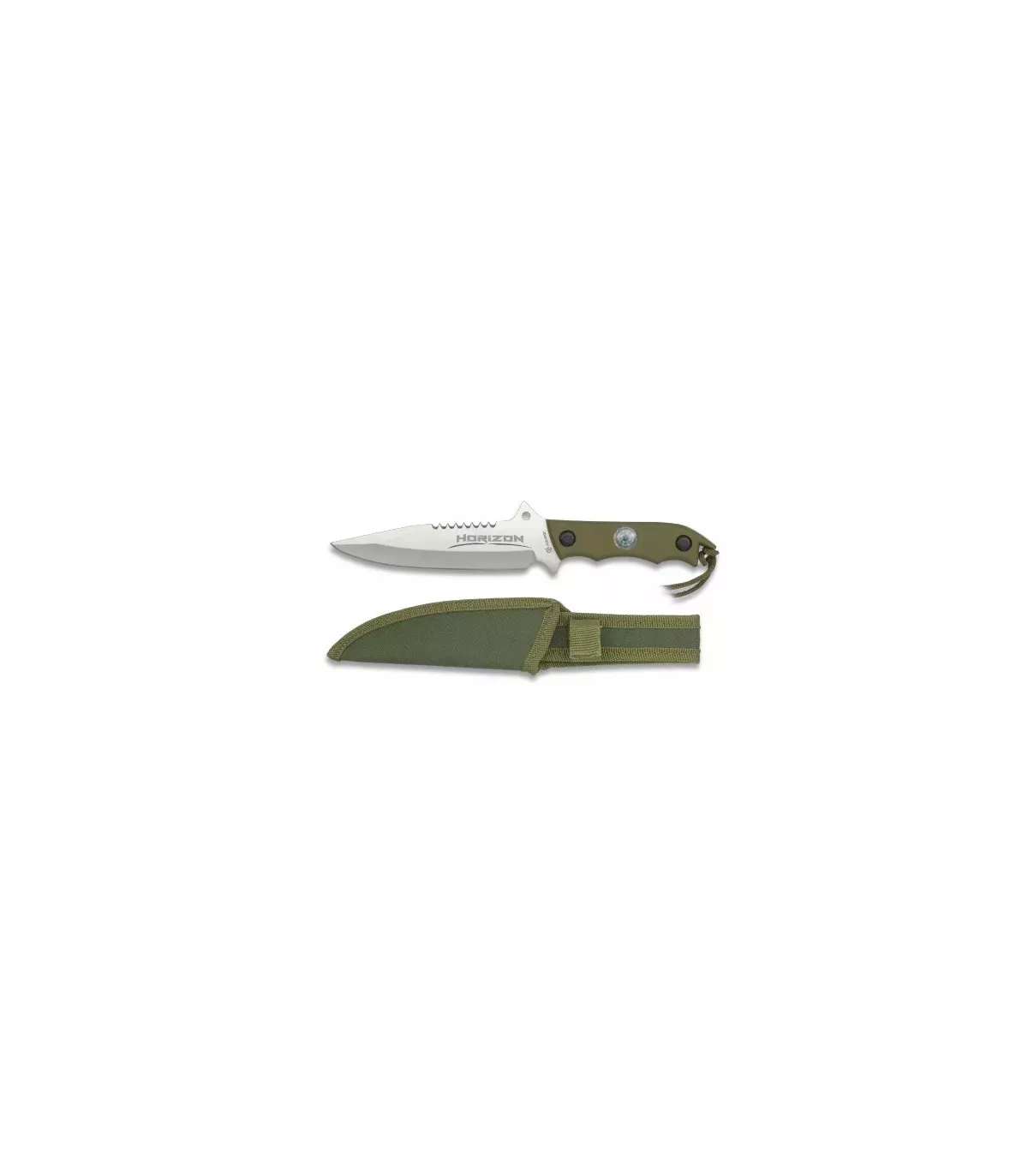 Você está procurando uma faca tática versátil e resistente para suas aventuras ao ar livre? A Faca Tática Horizon com cabo verde em ABS e lâmina em aço inoxidável escovado com contrafilo superior dentado é a ferramenta perfeita para você! Com uma lâmina de 13,2 cm de comprimento em aço inoxidável e um cabo em ABS verde, esta faca tática proporcionará uma pegada firme e confortável em todos os momentos.
