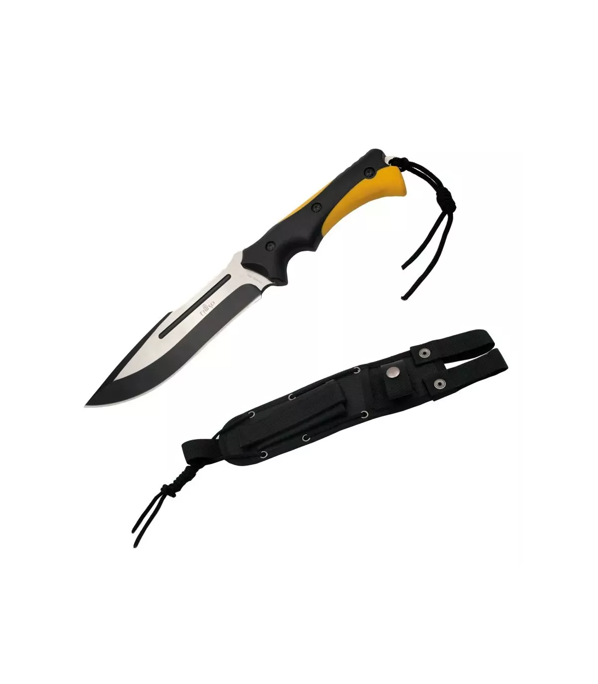 Você está pronto para levar suas aventuras ao próximo nível? Então, a faca tática Third é a companheira perfeita para você. Com uma lâmina de aço inoxidável de 18,5 cm de comprimento, você poderá enfrentar qualquer desafio com confiança e segurança. Além disso, sua empunhadura de borracha preta-amarela com anel para corda permitirá que você tenha uma pegada firme e confortável o tempo todo.