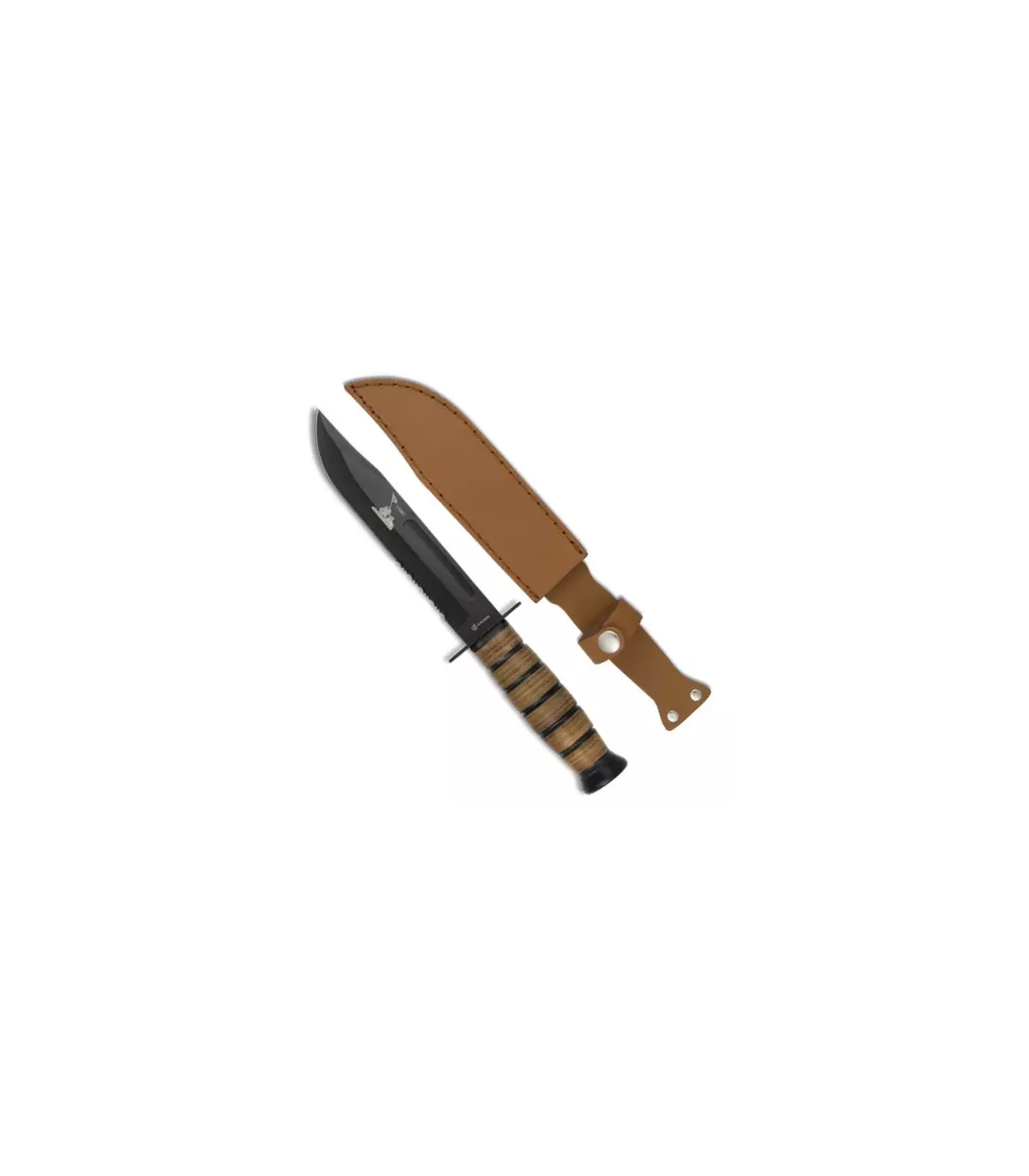 Fabricada com materiais de primeira qualidade, esta faca tática é capaz de cortar através de qualquer material com facilidade e precisão. Além disso, inclui uma bainha de couro para que você possa transportá-la de forma segura e confortável.