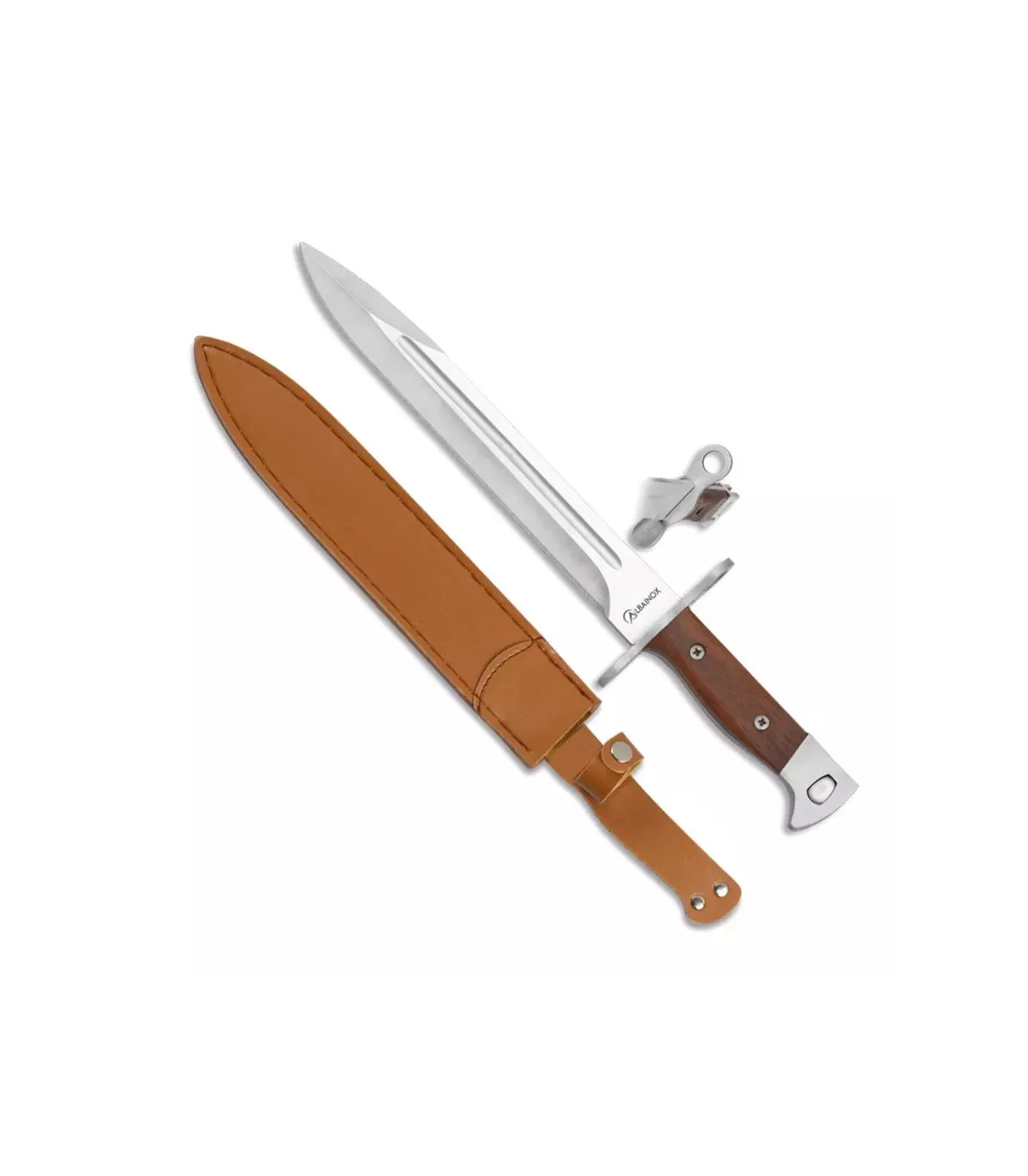 Além disso, inclui uma bainha de couro de alta qualidade, permitindo transportar e armazenar sua faca de forma segura e conveniente enquanto se move pela natureza. Esta faca tipo baioneta da Albainox é o acessório indispensável que garante precisão e eficiência em cada corte, seja para abrir caminho, preparar alimentos no acampamento ou como parte do seu equipamento de caça.
