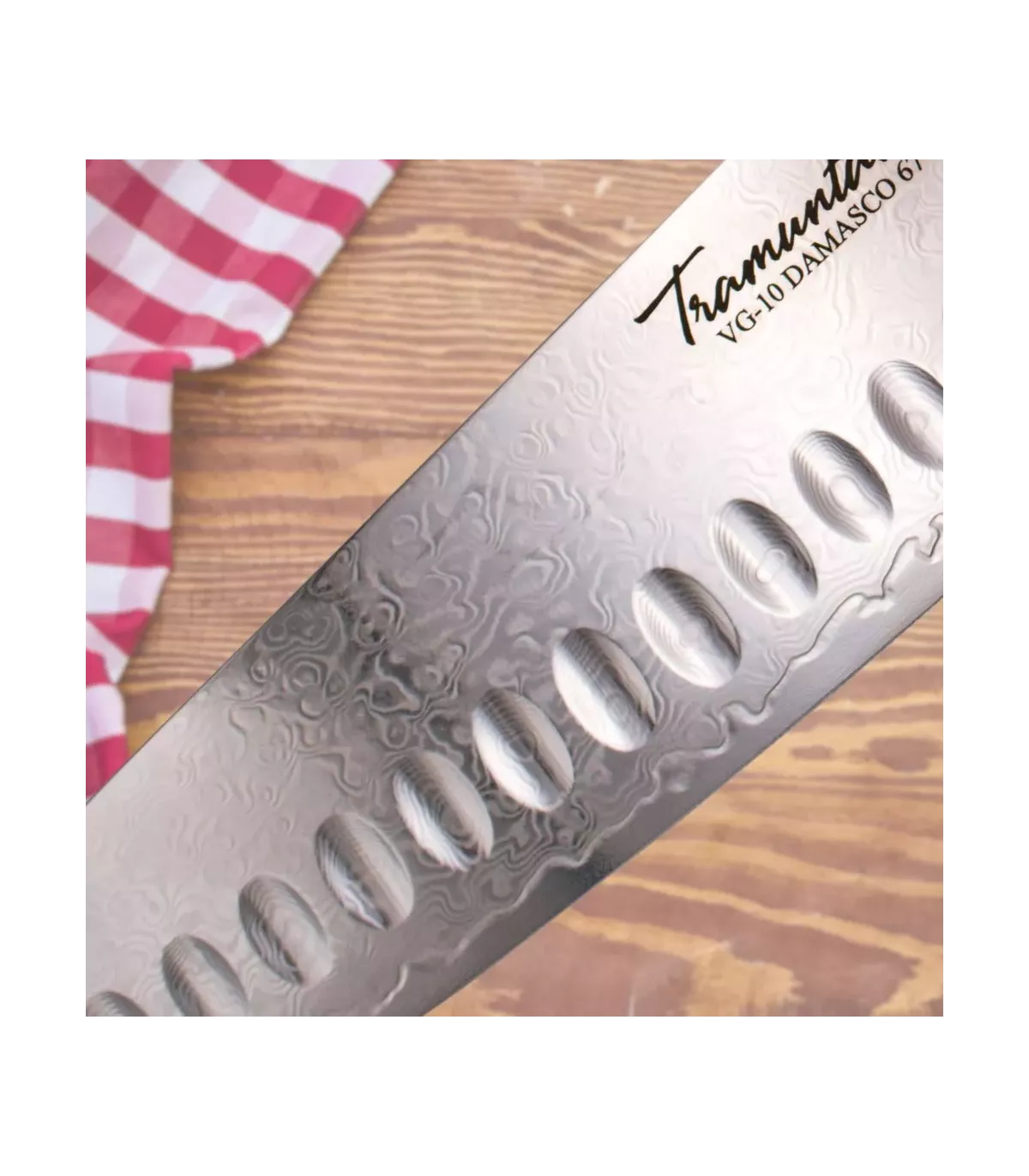 A faca de cozinha Tramuntana modelo CD11 Santoku é uma ferramenta premium, projetada especialmente para chefs e entusiastas da culinária que buscam precisão e elegância em cada corte. Sua lâmina de aço damasco VG10 de 67 camadas, com comprimento de 17,9 cm e espessura de 2 mm, permite realizar cortes suaves e precisos, ideal para preparar carnes, vegetais e peixes com a versatilidade característica do estilo Santoku.
