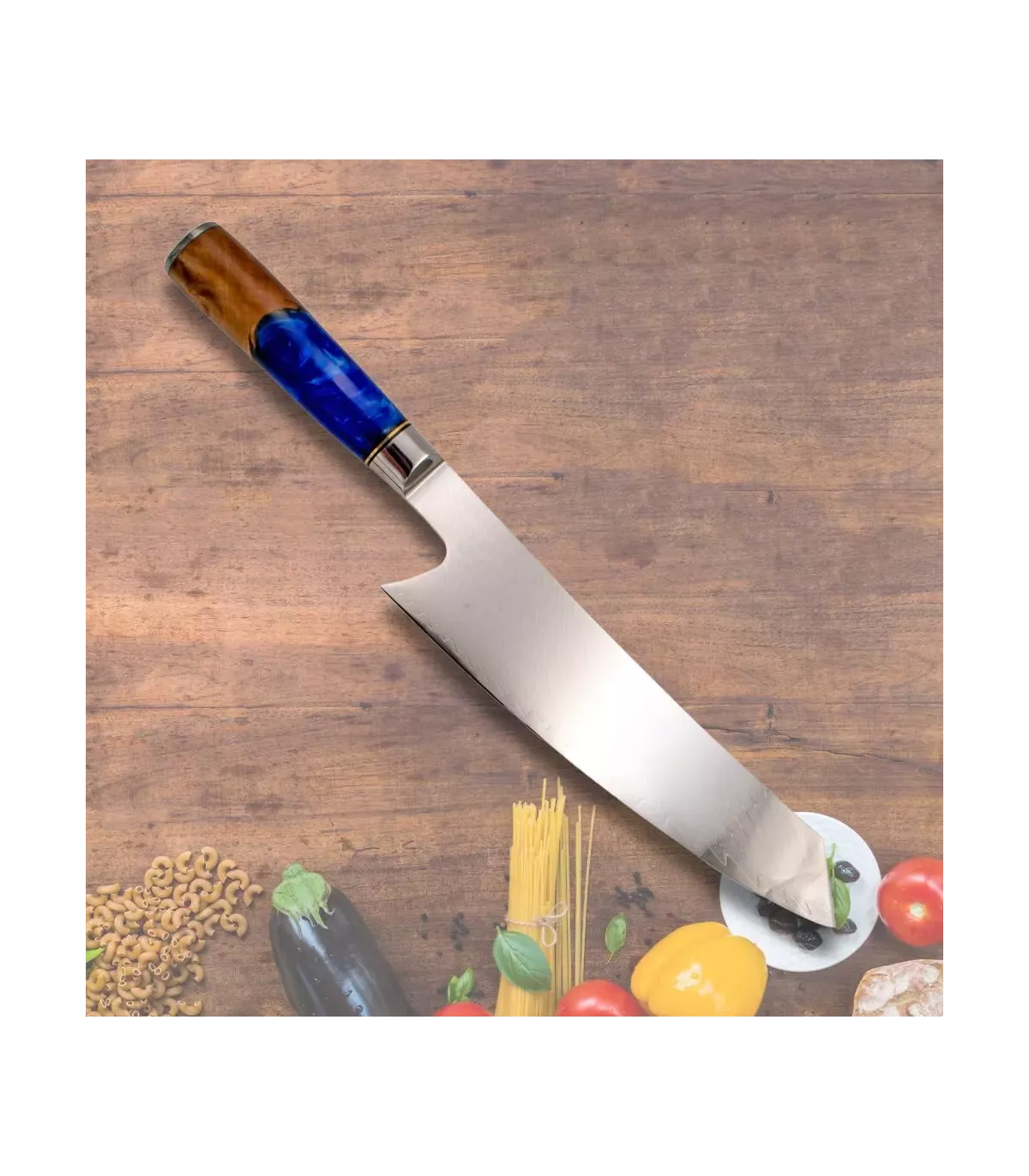 A empunhadura, fabricada em madeira estabilizada com epóxi, não só proporciona uma pegada confortável e segura, mas também acrescenta um toque estético que destaca a qualidade artesanal do produto. Cada faca é única, oferecendo a oportunidade de desfrutar de um utensílio que reflete personalidade e distinção.