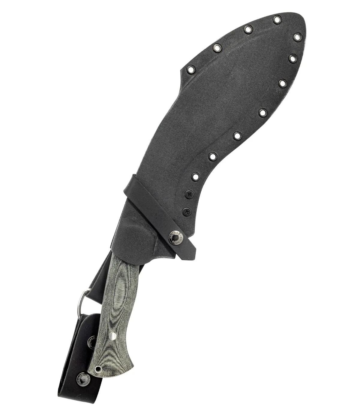 A bainha de Kydex, projetada sob medida, garante um ajuste perfeito e seguro, permitindo que você carregue a faca com facilidade e acessibilidade. Além disso, possui uma argola para cinto que assegura que seu kukri esteja sempre ao alcance da mão.