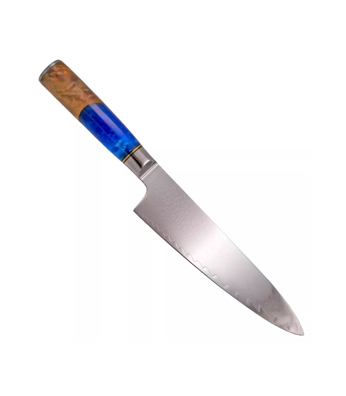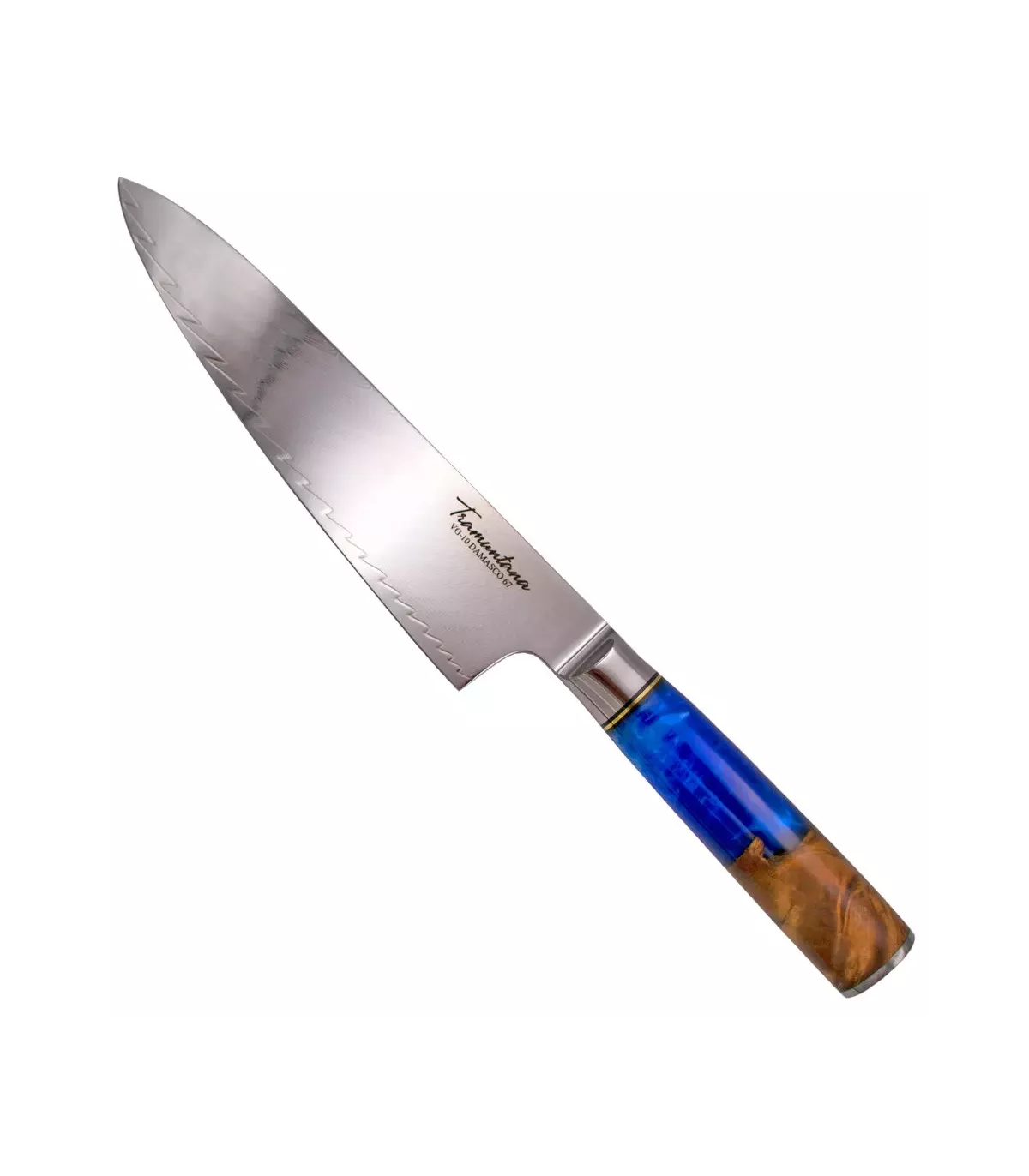 O cabo, confeccionado em madeira estabilizada de tons marrom e azul, proporciona uma pega confortável e segura, permitindo um controle ótimo durante suas preparações. Este material não só é esteticamente atraente, mas também extremamente resistente à umidade e às variações de temperatura, garantindo sua integridade ao longo do tempo. O acabamento com epóxi adiciona um toque de brilho e durabilidade adicional, tornando o cabo não apenas confortável, mas também resistente e fácil de manter.