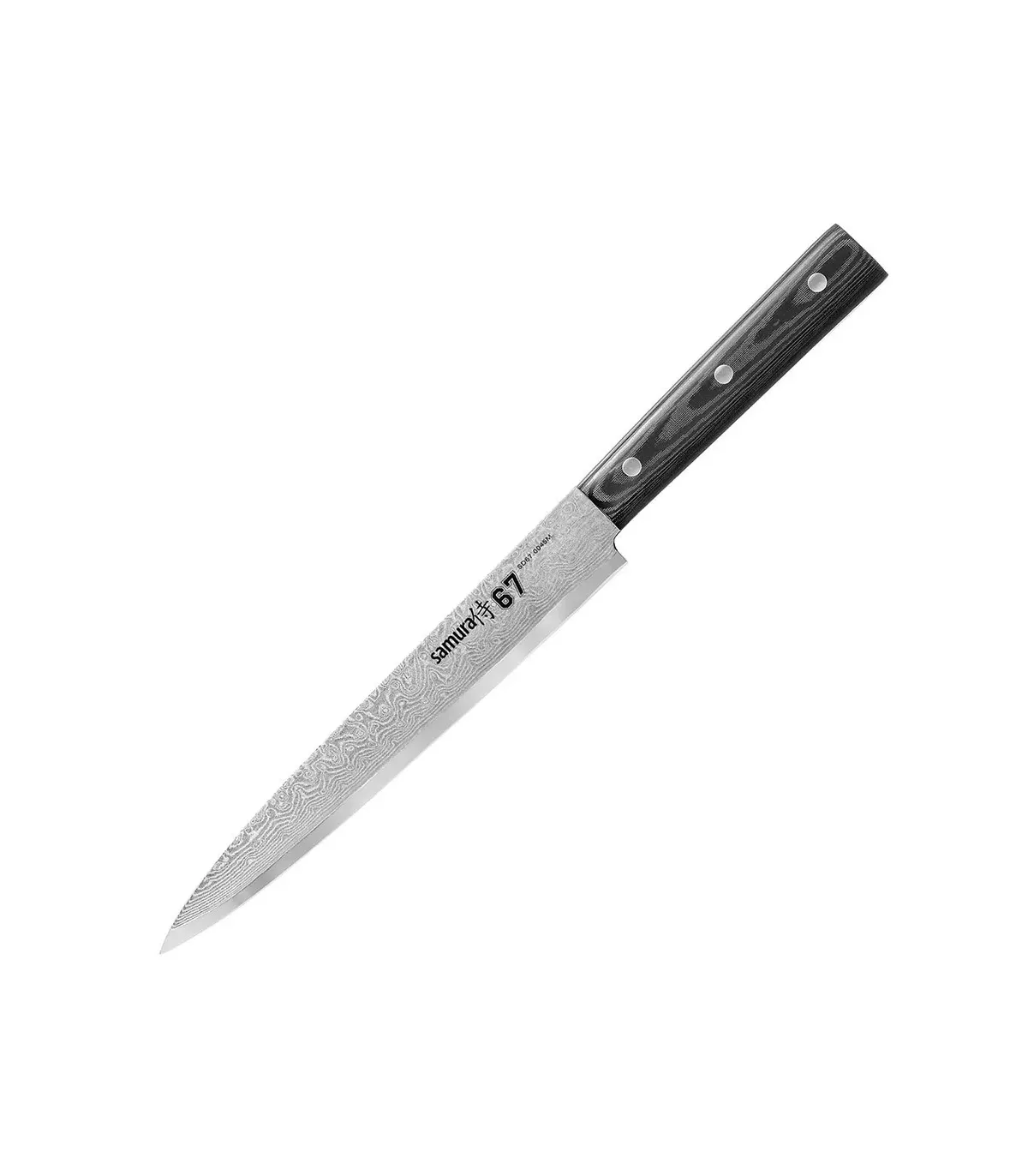 A lâmina da faca é fabricada com a impressionante construção de 67 camadas de aço, característica da série Damascus 67 da Samura. Esta construção não só confere à faca uma aparência única e distintiva, mas também proporciona uma dureza e durabilidade excepcionais.