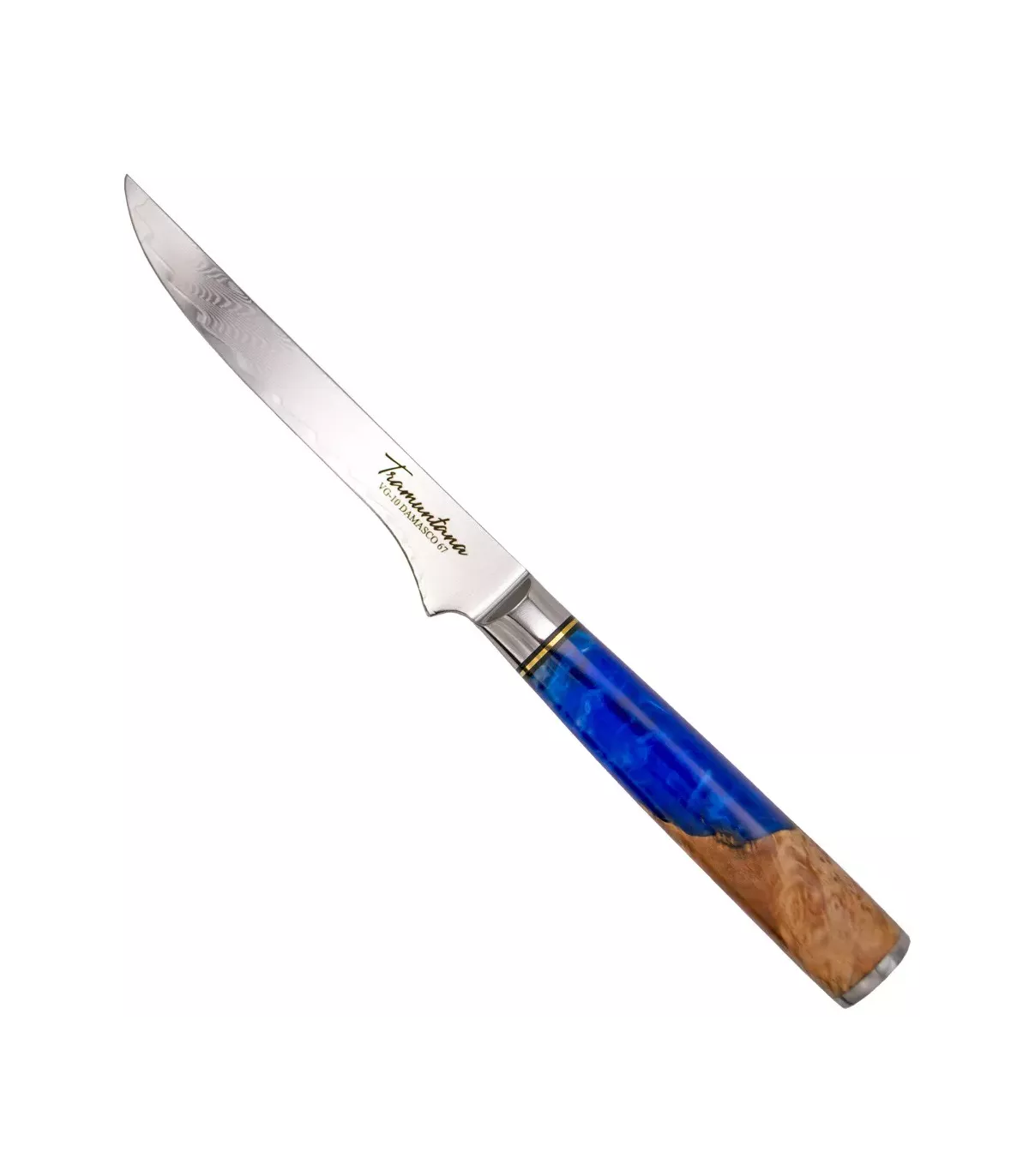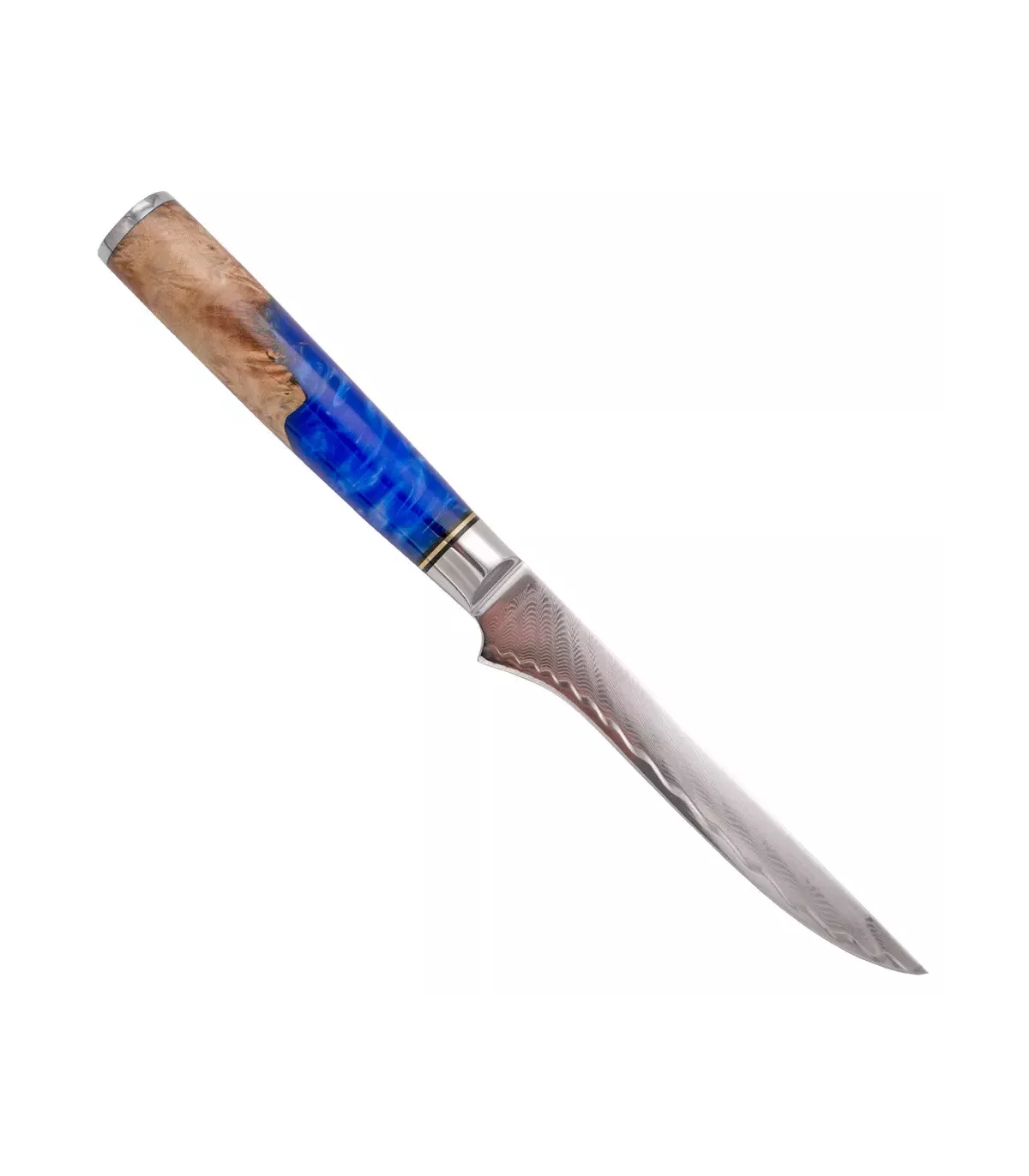 O cabo desta desossadora é feito em madeira estabilizada em elegantes tons de marrom e azul, combinado com um acabamento epóxi que garante resistência à umidade e uma pegada confortável e segura. Este design ergonômico não só facilita o controle durante o uso, como também reduz a fadiga na mão, permitindo trabalhar com maior conforto em preparações longas e detalhadas.