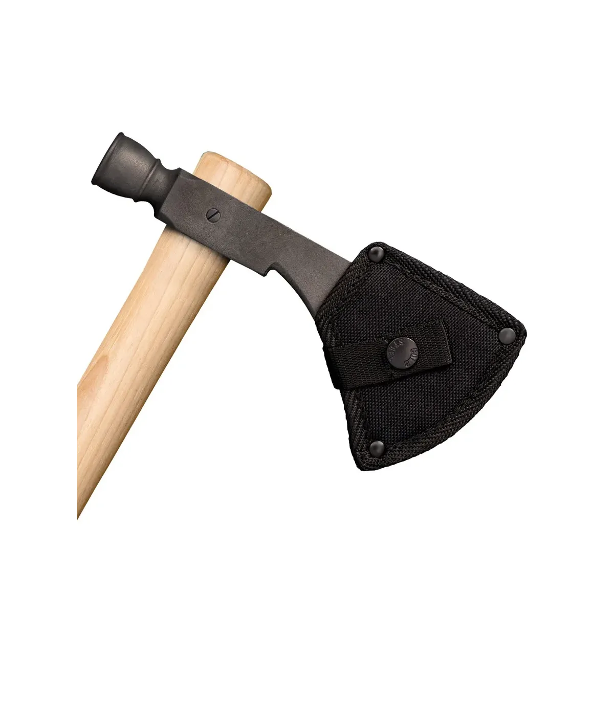 Machado Índio modelo de Pipa da Cold Steel. Oferece uma lâmina de corte longa e larga e uma coluna de martelo sólida e completamente temperada que está torneada e estriada para imitar um recipiente de tubo oco tradicional. Tem um cabo de nogueira de aproximadamente 56 cm e é pesado o suficiente para ser eficaz como ferramenta para picar. Além disso, seu recipiente sólido pode cravar pregos, estacas e piques com a força de um martelo de enquadrar. Nota: Não funciona como um cachimbo.