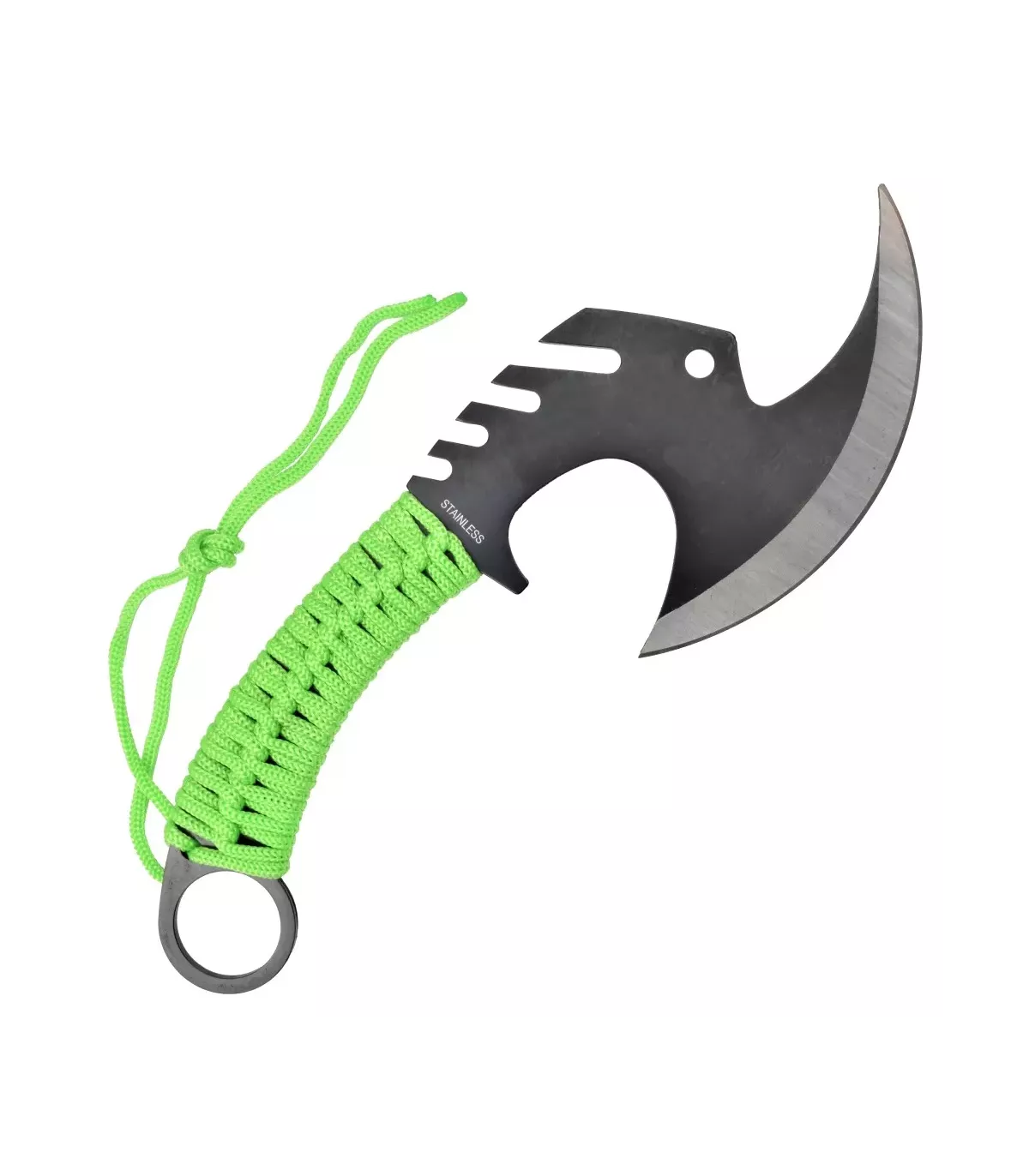 A empunhadura revestida com cordão paracord verde garante uma pegada confortável e segura, mesmo em condições úmidas ou escorregadias. Além disso, vem decorada com o logo de biohazard e as palavras Zombie Killer, tornando este machado uma peça única e chamativa para qualquer coleção de armas.
