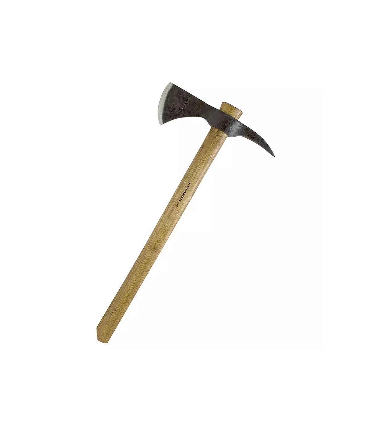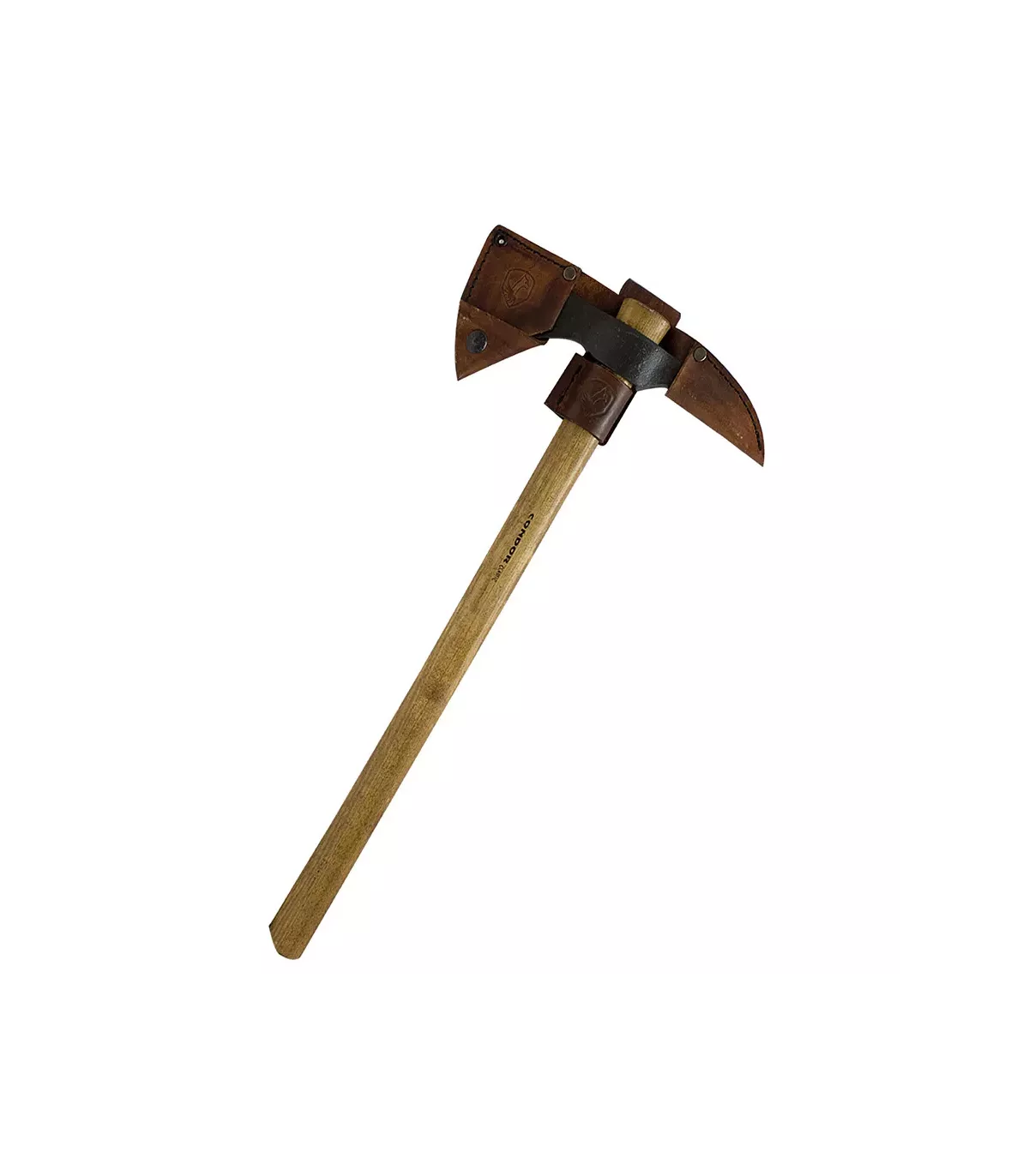 Machado Condor Índia com ponta e bainha de couro. A cabeça é feita de aço forjado com alto teor de carbono 1060, tratada termicamente e recozida a aproximadamente 50-55 de dureza Rockwell, com acabamento Condor Classic. Este acabamento é um processo aprimorado de martelamento manual que confere uma aparência clássica e aprimorada a uma ferramenta já bem feita. Os artesãos da Condor usam equipamento manual para alcançar esse padrão tradicional e dar uma aparência como se tivesse sido forjada à mão há mais de 200 anos.