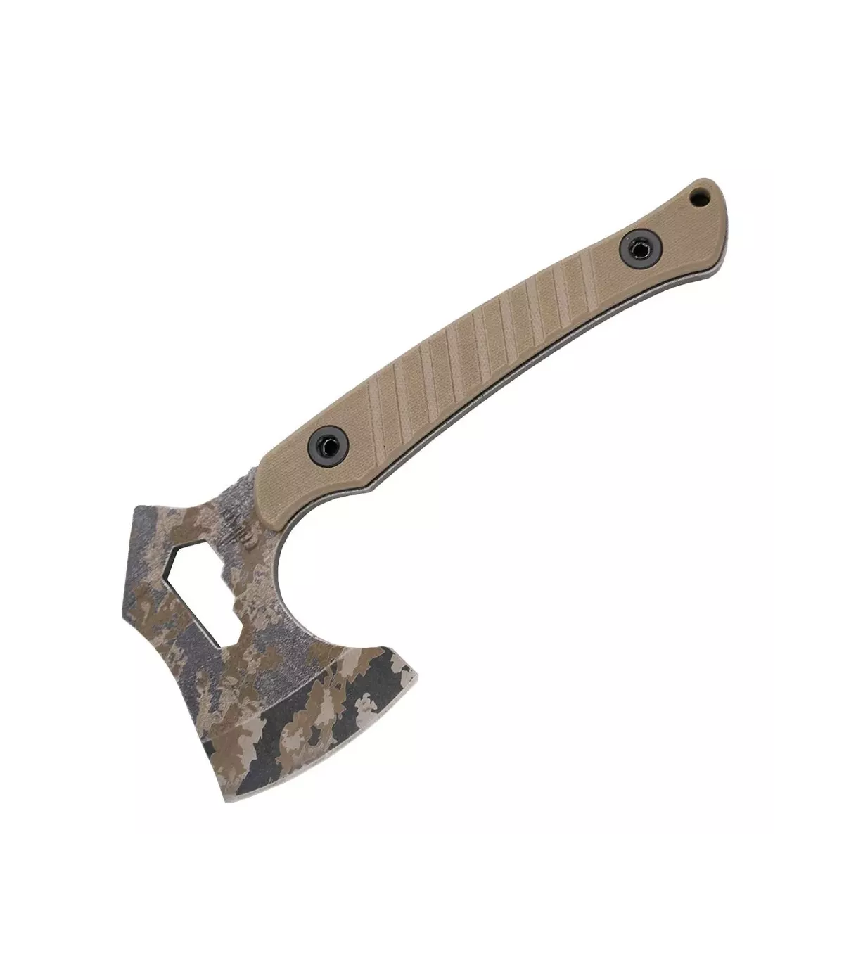 Procurando uma ferramenta de alta qualidade com um design único e chamativo? O Machado Tático da marca Third é exatamente o que você precisa. Este impressionante machado tático possui uma lâmina de aço 420 com acabamento em padrão de camuflagem, tornando-o resistente e durável para qualquer tarefa que você precise realizar. Além disso, sua empunhadura de G10 camelo é ergonômica e confortável para uma pegada segura e eficiente.