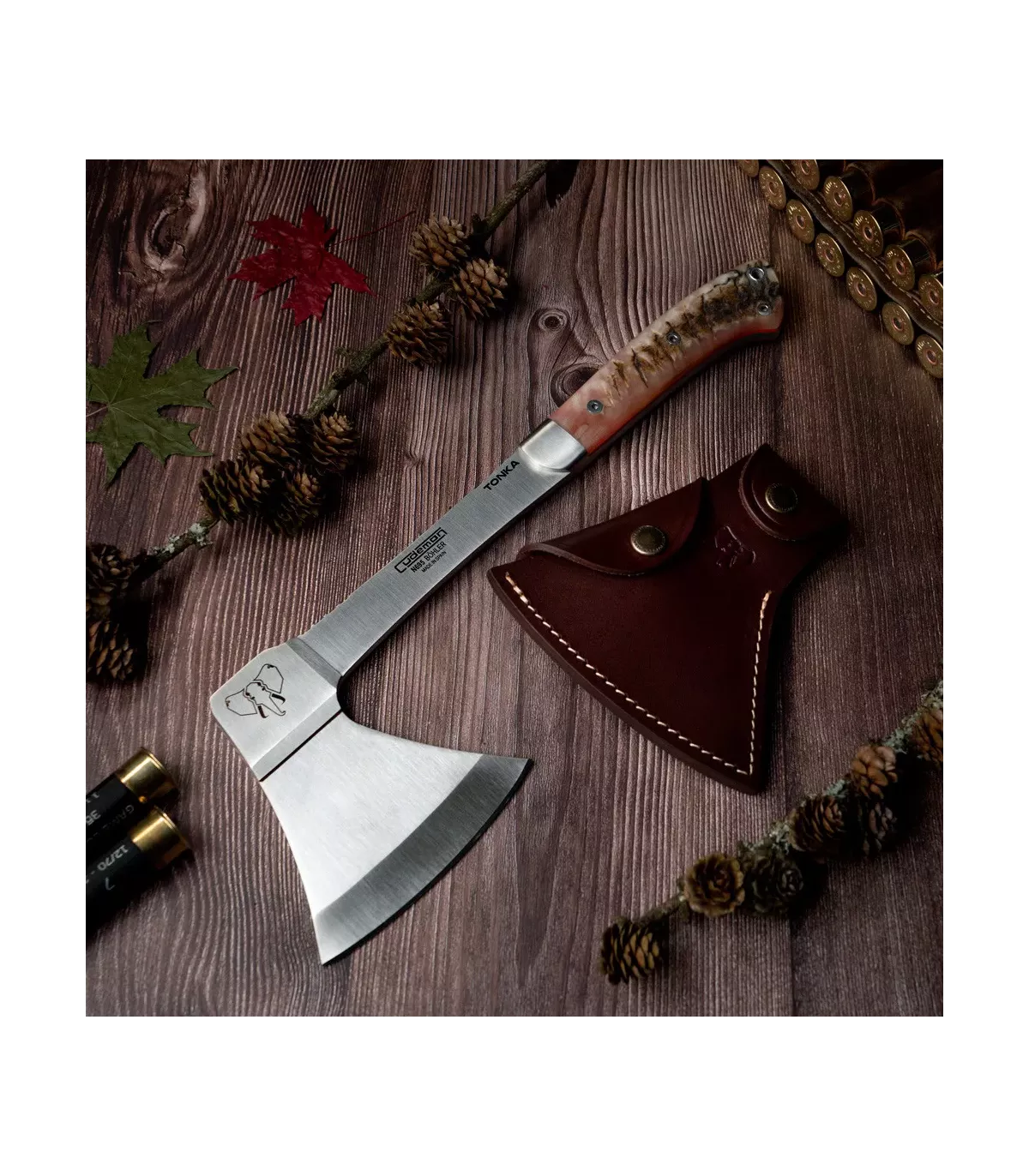 A lâmina de aço Böhler N695 de alta qualidade e o cabo de osso rústico formam uma combinação impressionante, conferindo a este machado uma aparência excepcional. Além disso, acompanha uma bainha de couro que o protege e permite levá-lo com total segurança. Não importa se você está caçando, acampando ou simplesmente explorando a natureza, este machado de caça é a ferramenta perfeita para acompanhar suas aventuras.