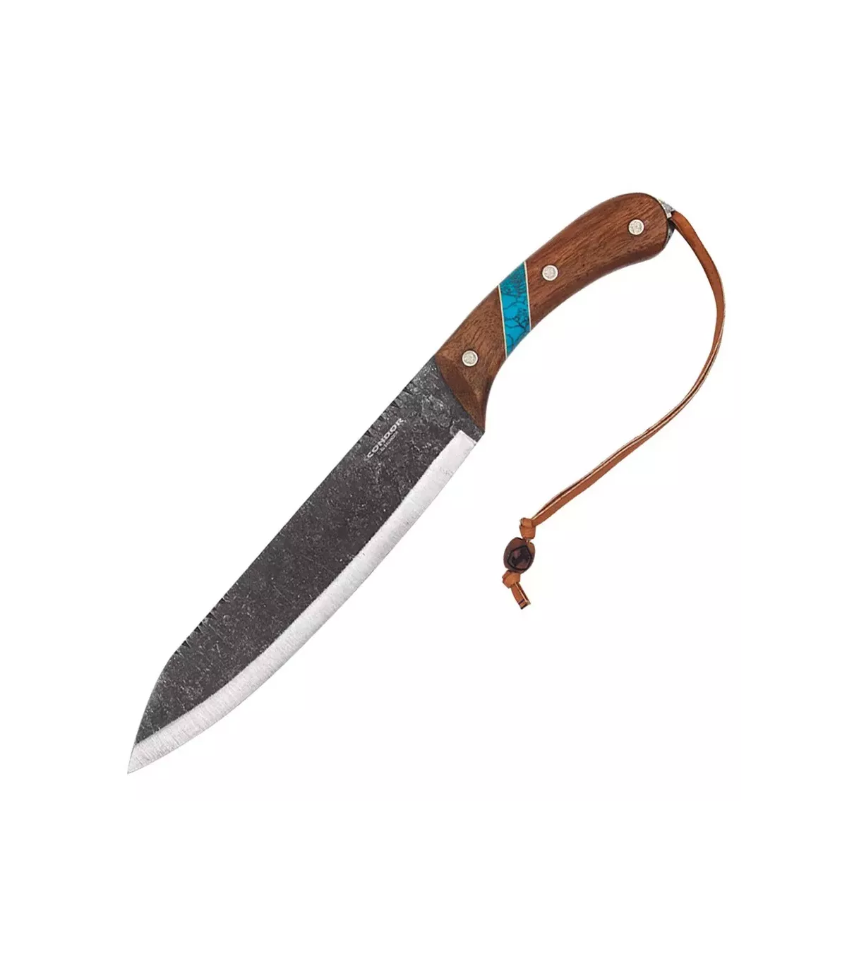 Este facão vem com uma lâmina de aço com alto teor de carbono 1075 de 25,4 cm, com acabamento natural. Inclui uma bainha de couro reforçada que pode ser presa à perna ou ao cinto.
