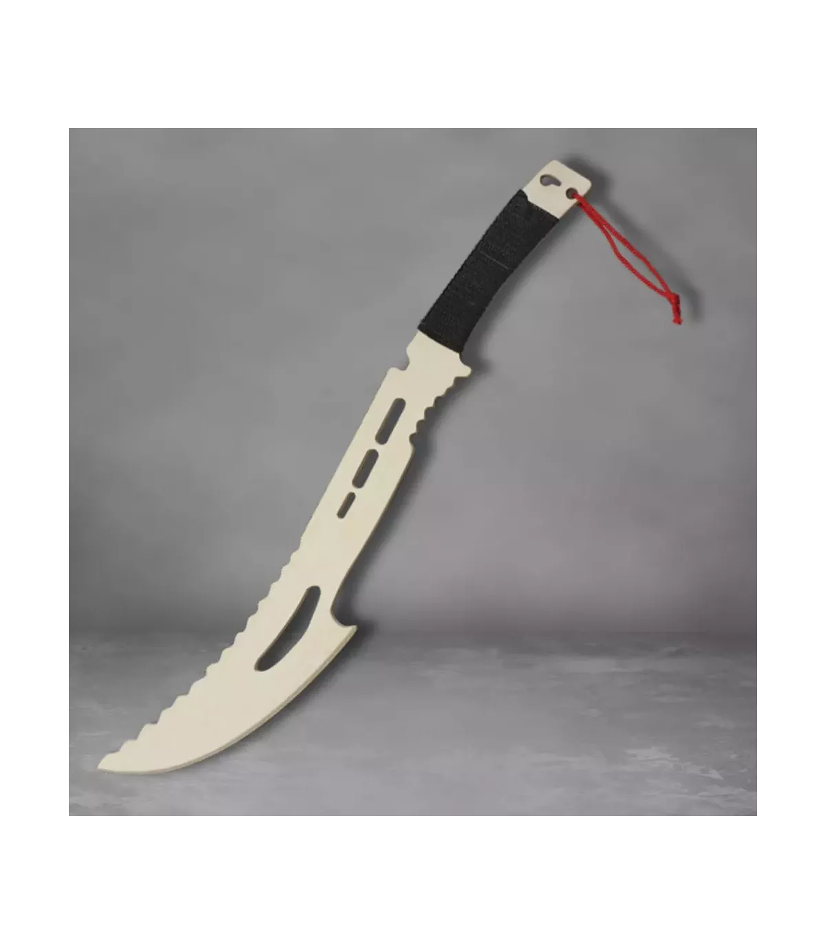 Seu design distinto, com uma lâmina curva e uma parte serrilhada na parte superior, não é apenas atraente, mas também pensado para simular a experiência de um facão real, permitindo que você pratique com total tranquilidade. O acabamento em madeira clara traz um toque natural, enquanto a empunhadura preta, confortável e ergonômica, garante uma pegada firme em cada movimento.