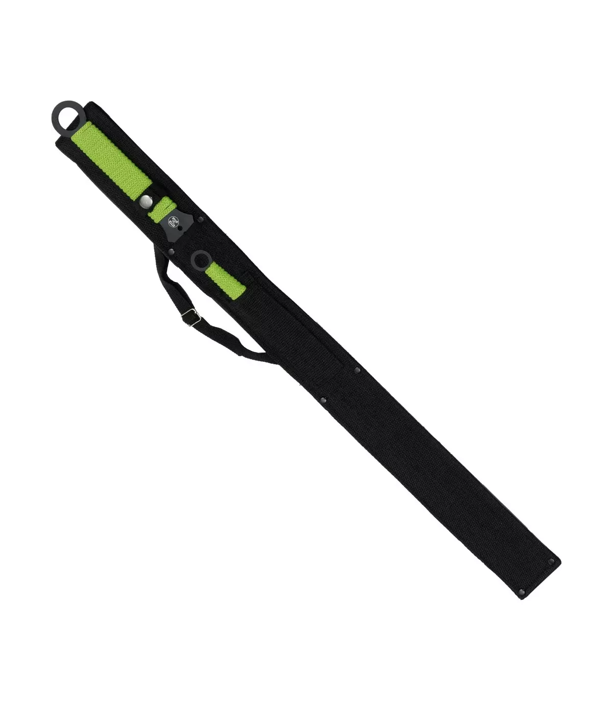- Cabo Envolto em Cordão Verde Zombie para Melhor Toque: O cabo envolto em cordão verde zombie não só proporciona uma pegada confortável e segura, mas também acrescenta um aspecto distintivo ao design do facão. Este revestimento melhora a experiência de manuseio.